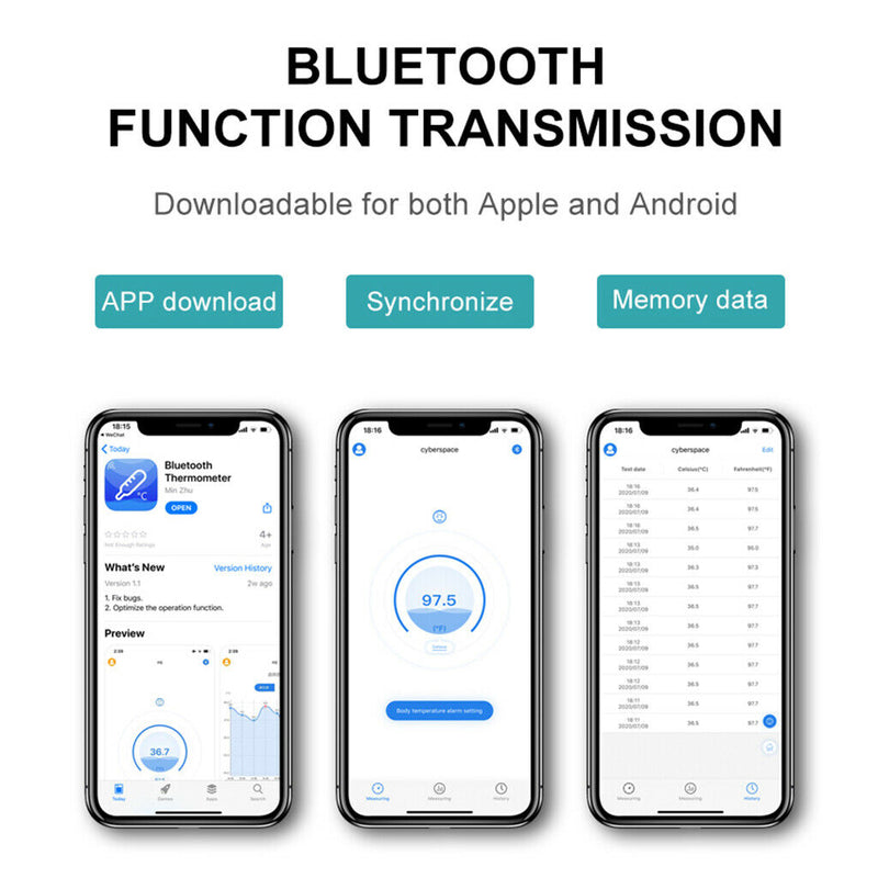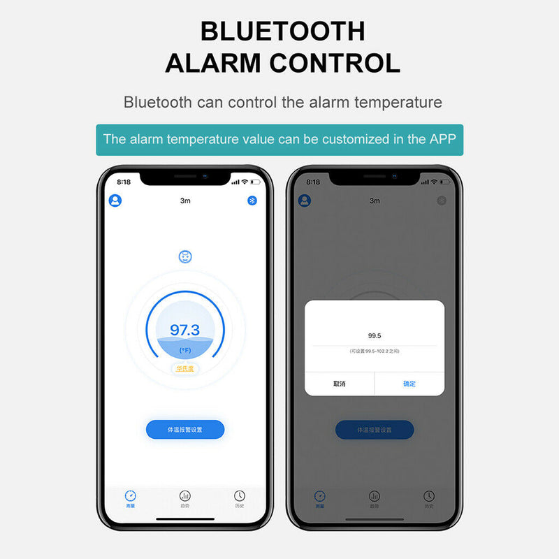 ITEM NAME:Adults Bluetooth Infrared Forehead Thermometer Doorbell LCD Display for School Description: Â °C/Â °F Switchable Easily & Accurate Readings It can be.Pressing the button to switch it. Display: digital display. ALARM FUNCTION: A green light will indicate that their temperature is within a normal range, and a flashing red light and audible alarm will indicate that the person has a high temperature when the temperature is over high>37.5Â °C or 99.5Â °F.