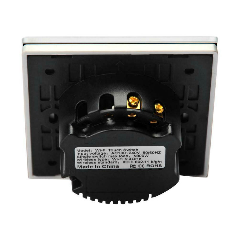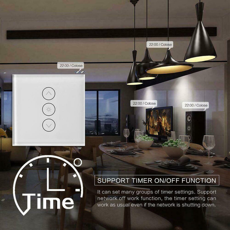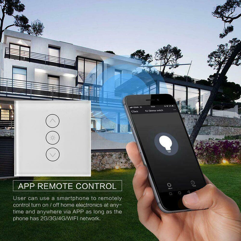 ITEM NAME:Wireless WiFi Smart Touch Light Switch Dimmer Button Voice Control (EU) Product Description Description: Feature: 1. Touch switch, tempered glass-ceramic panel, can adjust the brightness of the lamp through the + / - button. 2. Support remote control of mobile app. 3. Support for Amazon Alexa and for Google home, and realize voice control after pairing. 4. Support iOS / Android system. Specification: Rated voltage: AC100-240V AC frequency: 50Hz-60Hz Load power: