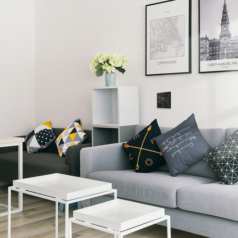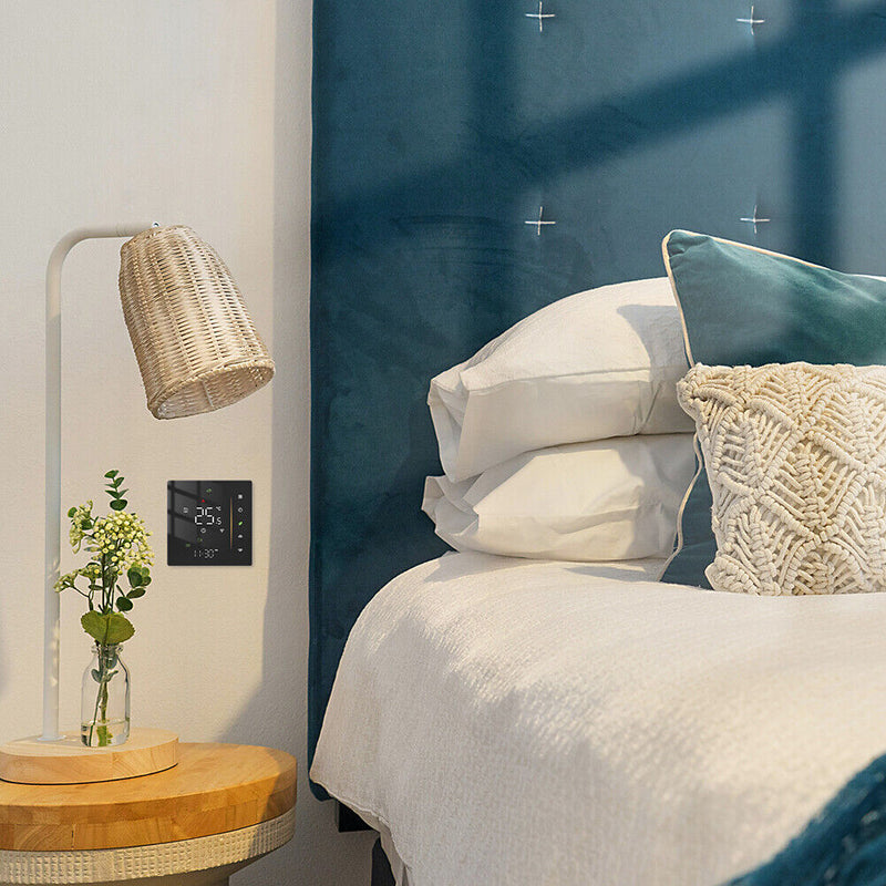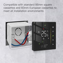 2.Bezel-less and Windowless Touch Control:Amazing new touch design with lens edge 2.5D arc effect ensures its extremely visual enjoyment and soft touch feeling,together with colorful LED screen display that looks like a beautiful scenery and hidden touch button simplifies the UI to a large extent.The ultra-thin embedded panel perfectly fits all kinds of walls,with standard 86mm square cassettes and 60mm European cassettes to meet all installation environments 0.5 accuracy keeps temperature within the level you set.