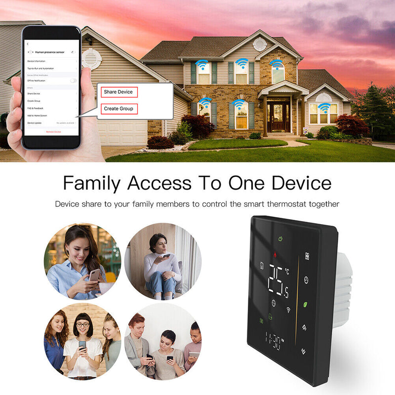 4.Smart Phone APP Remote Control:Remotely control your home temperature to attain advanced comfort via your Tuya/Smart Life App with no hub required,easy to operate on your smart phones anywhere you are,supporting the creation of product local groups/shares to achieve unlimited centralized control of the number of products/multi-terminal control for real-sensing intelligence.